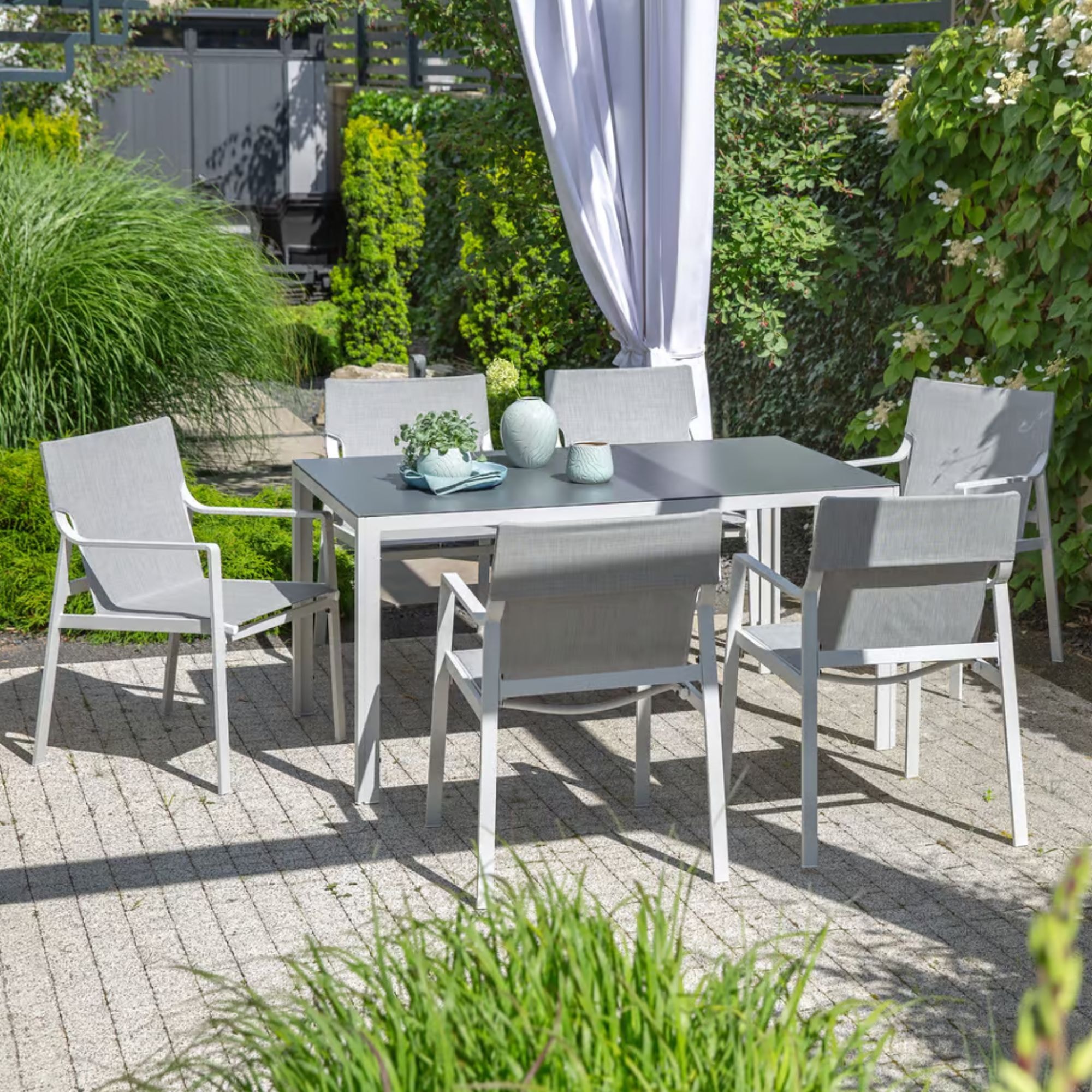 Gartenset in Grau, bestehend aus einem rechteckigen Tisch mit gehärteter Glasplatte, 6 Stühlen mit Armlehnen und einem rechteckigen Sonnenschirm. Die pulverlackierten Stahlrahmen garantieren Robsutheit und einen eleganten Look.