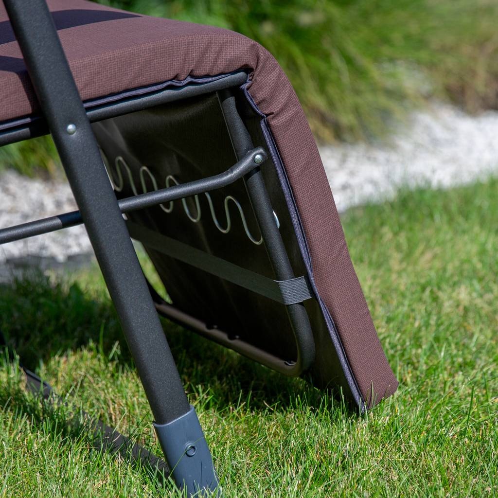 Der Rahmen der Liege besteht aus ovalen Stahlrohren mit Maßen von 36 x 18 mm, was Stabilität und Widerstandsfähigkeit bei intensiver Nutzung gewährleistet. Dank der Pulverbeschichtung ist der Stahl vor Korrosion geschützt, was seine lange Haltbarkeit auch unter schwierigen Witterungsbedingungen garantiert.