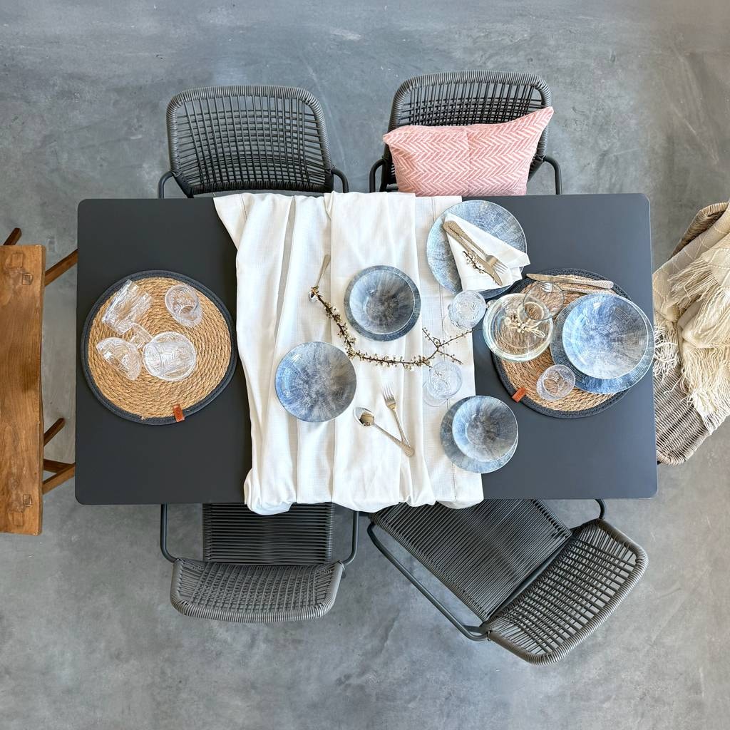 Das Set aus Tisch und vier Stühlen fügt sich harmonisch sowohl in moderne Gärten als auch in klassische Terrassen ein. Die neutrale Formgebung und das kompakte Format machen es zudem ideal für größere Balkone.