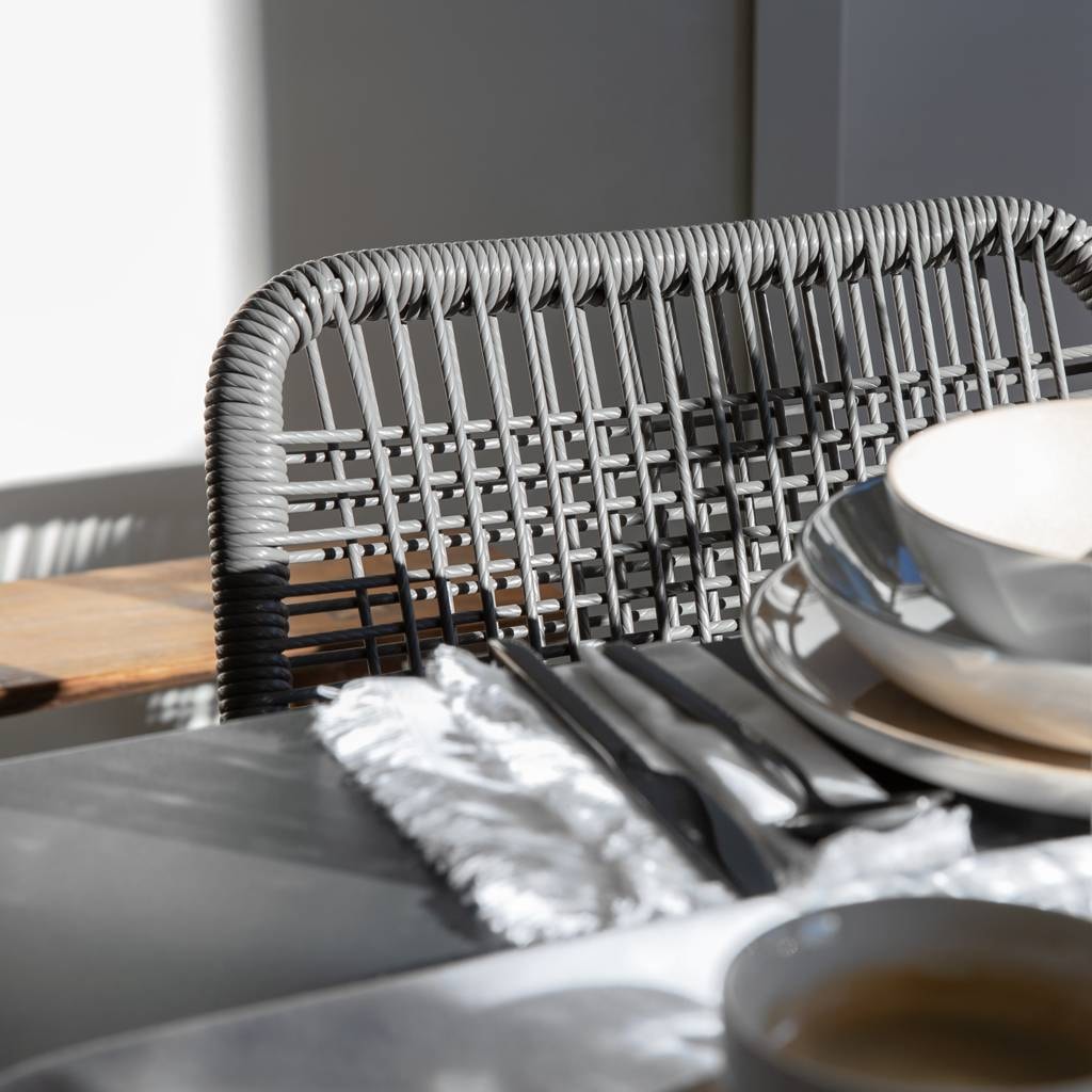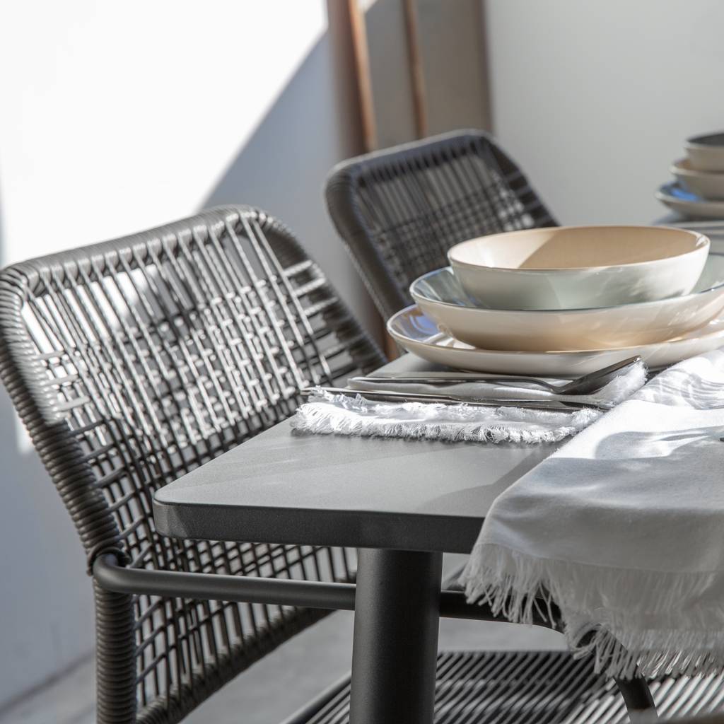 Die Gestelle bestehen aus pulverbeschichtetem Stahl, während die Sitzflächen aus einem robusten, wetterbeständigen Kunststoffgeflecht gefertigt sind – perfekt für den Einsatz im Freien.
