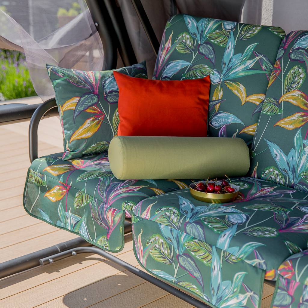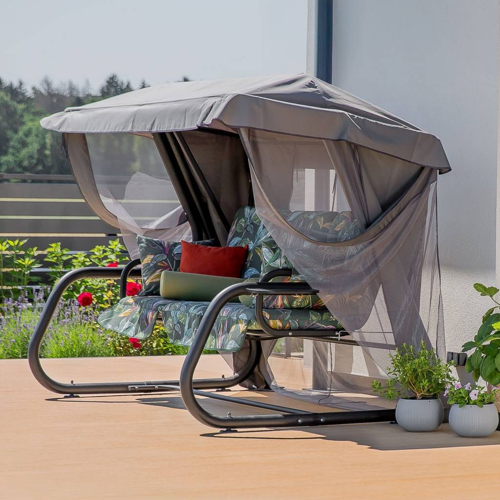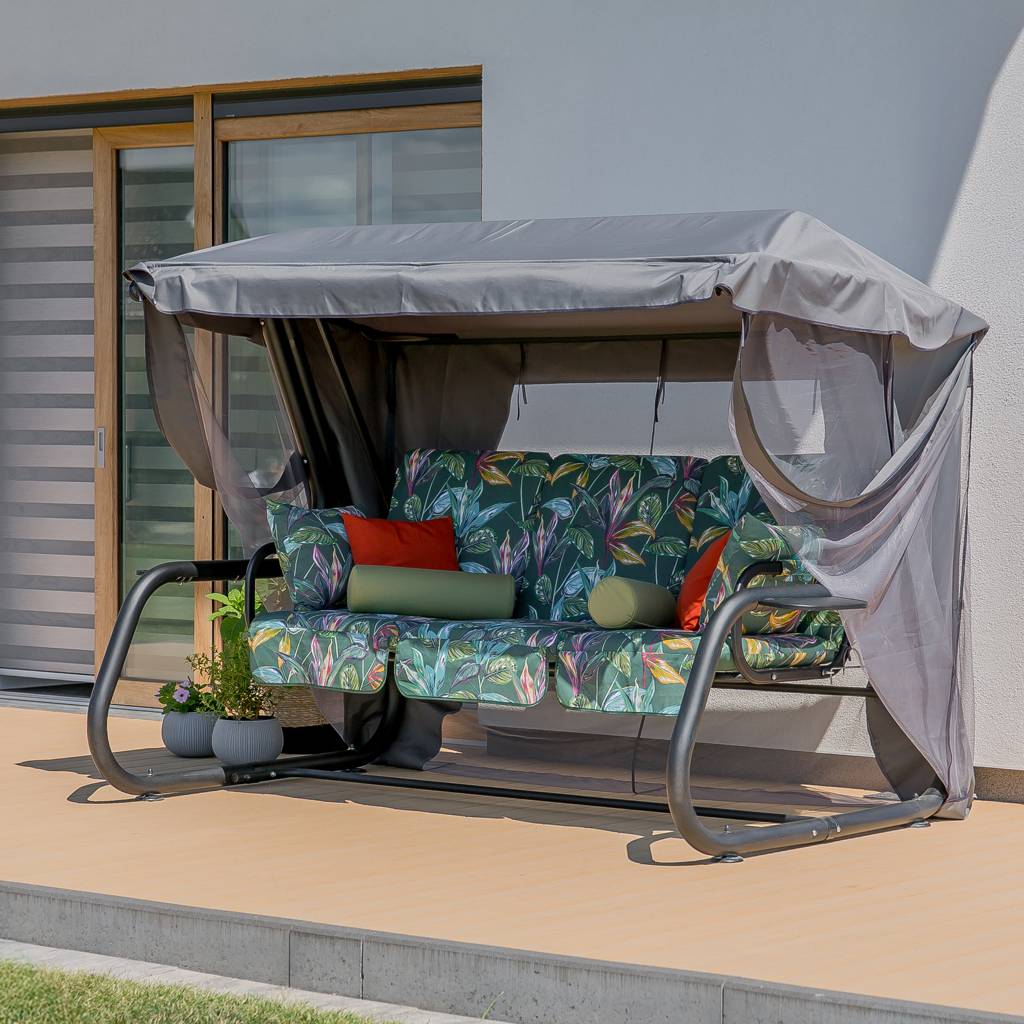 Die Gartenschaukel ist mit einem Set von 3 Sitzkissen sowie zusätzlichen 4 kleinen Auflagen und 2 Rollen ausgestattet. Die Auflagen sind aus einem strapazierfähigen Stoff hergestellt, der Haltbarkeit sowie leichte Pflege garantiert.