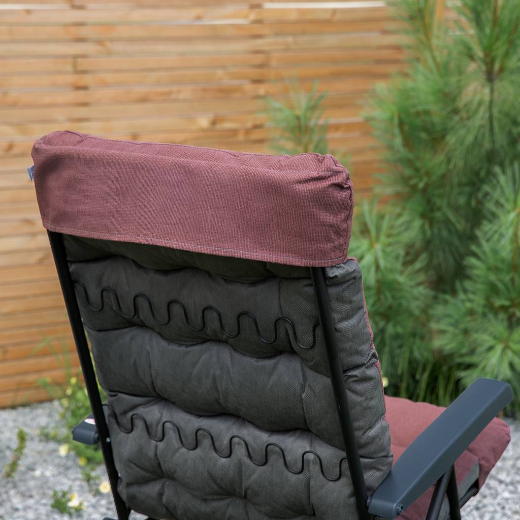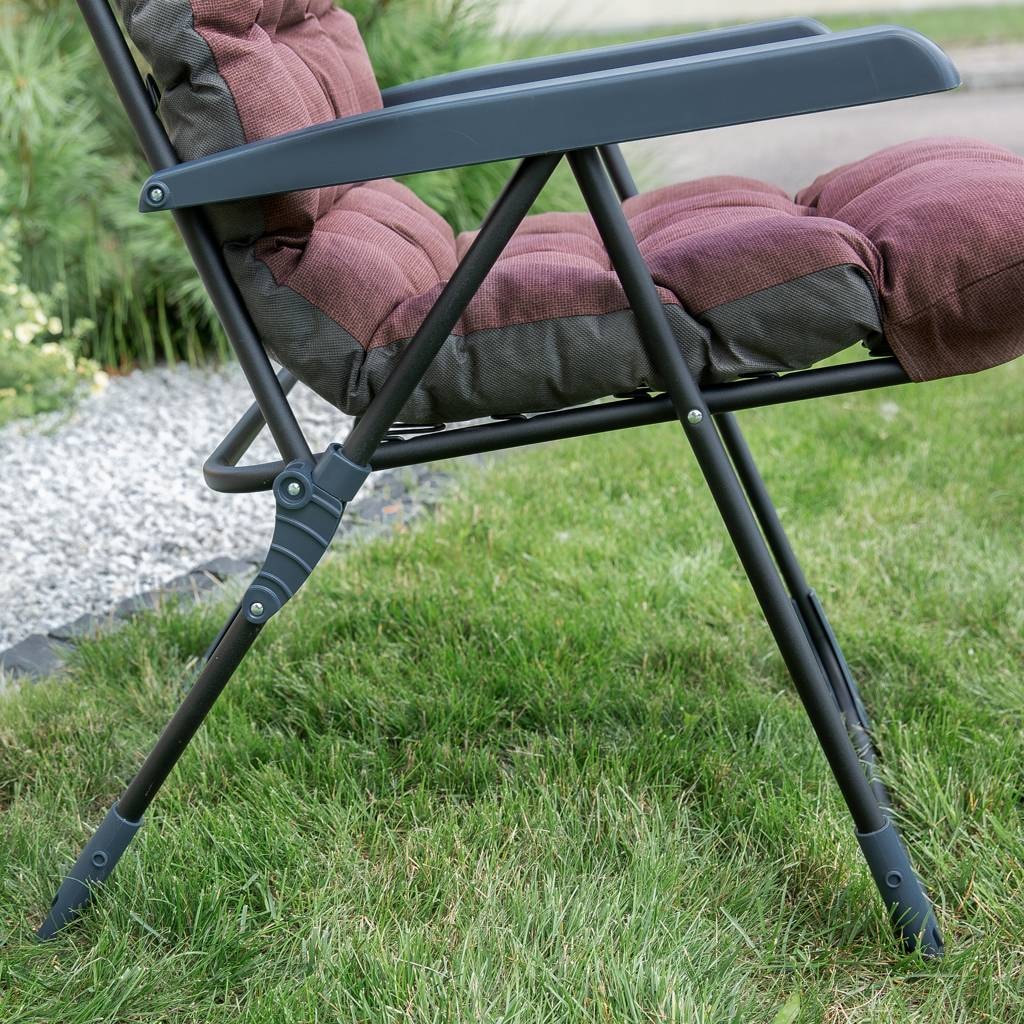 Der Gartenstuhl ist mit einem dicken, gesteppten Polster ausgestattet, das den Körper während längerer Pausen unterstützt.