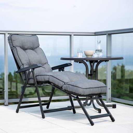 The Lena lounger with 28-position mechanism, steel frame, and quilted cushion provides exceptional comfort.