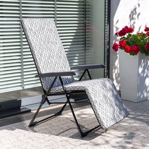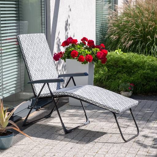 The folding lounger Modena with a multi-position mechanism, square backrest, steel frame, and comfortable seat ensures a relaxing experience in a garden.