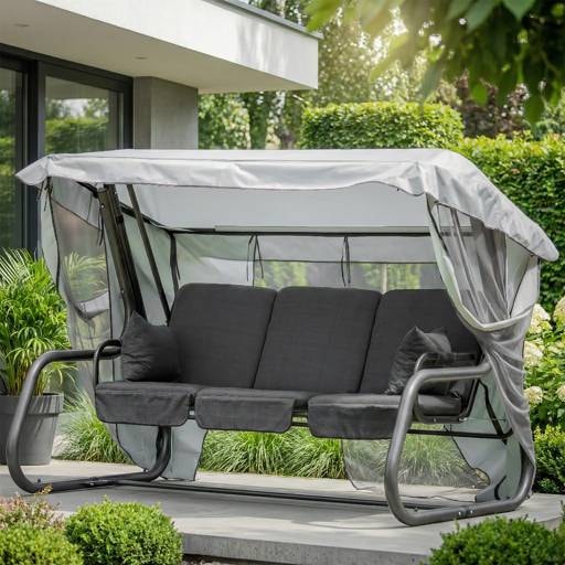 Stylish garden swing with a sturdy frame, a comfortable four-seater, and an adjustable canopy with a mosquito net, perfect for the garden.