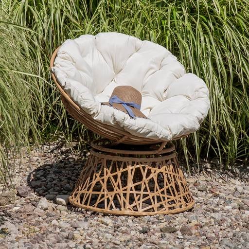 The hanging cocoon chair with cushions is a comfortable and stylish seat made of polyrattan, ideal for relaxing in a garden or on a terrace. Durable, stable, and easy to clean.