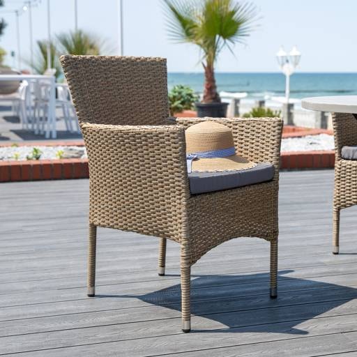 Classic garden chair with a sturdy construction and comfortable armrests, perfect for any patio. Comes with a comfortable cushion.