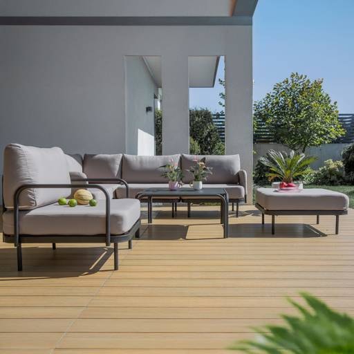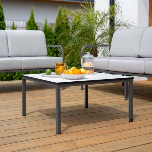 The modern garden furniture set in anthracite color featuring two sofas with built-in tables, a corner sofa, and a coffee table with an aluminum top. The included cushions ensure comfort.