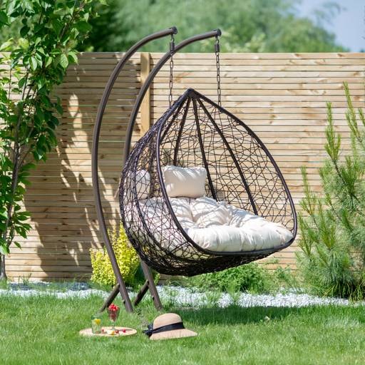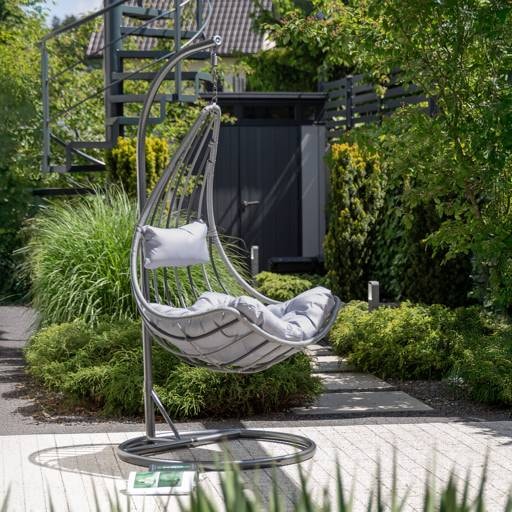 Hanging chair for garden, balcony, and home. Stable construction, comfortable cushions, and polyrattan – ideal chair for any space.
