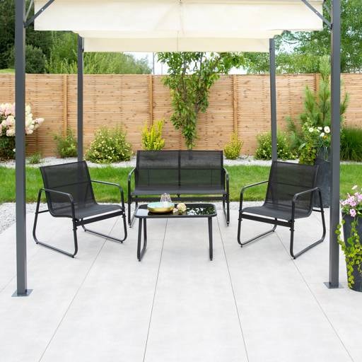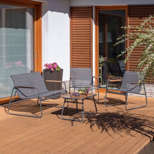 The garden furniture set in anthracite color is elegant and functional. Consists of a sofa, two armchairs, and a table. The aluminum frame provides lightness and resistance to corrosion, and the textiline used in the seats is durable and comfortable to use. Includes cushions. An ideal choice for a terrace, balcony, or garden.