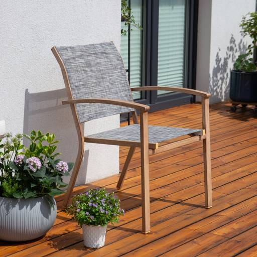 Sturdy garden chair made of plastic that resembles wood. Solid steel construction.