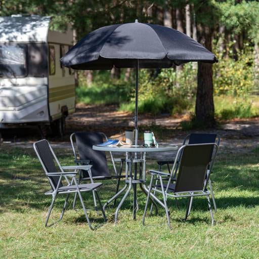 The furniture set is a practical solution for a garden or terrace. The set includes: glass table, 4 folding chairs, and a parasol. Compact, lightweight, and weather-resistant – ideal for outdoor gatherings and meals.