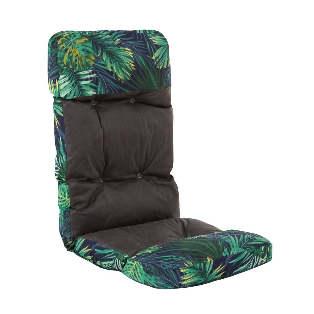 A thick cushion for a reclining garden chair provides exceptional comfort for outdoor relaxation. The filling made of flocke cut foam gives it softness and resilience, while the quilting on the backrest and seat enhances aesthetics and keeps the filling in place. The top of the cushion is made of soft fabric, and the bottom is made of durable polypropylene, which is more resistant to moisture. Pockets on the back allow for easy and stable attachment to the chair frame, preventing the cushion from sliding.