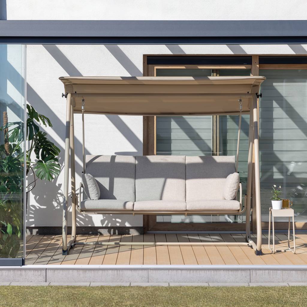 A modern garden swing with a reclining function is the perfect place to relax outdoors. The spacious seat for four people and the possibility of unfolding the backrest to a lying position allow you to create a comfortable relaxation zone in the garden or on the terrace in a few moments. The solid steel frame ensures stability and durability, and comfortable cushions made of Olefin fabric increase the comfort of use. A canopy with a mosquito net and a practical table make resting even more pleasant. Discover convenience and relax in the fresh air.