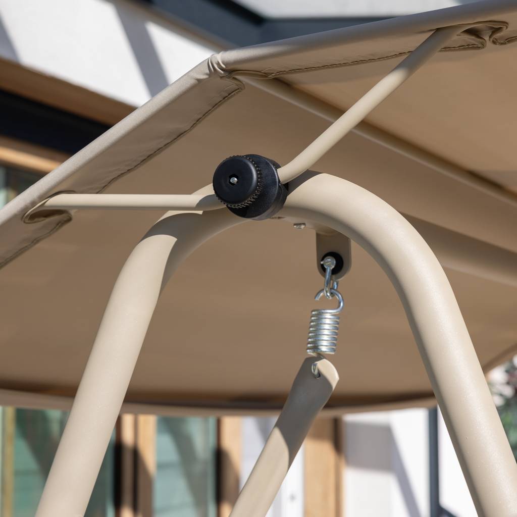 The swing is equipped with a large canopy measuring 229 × 132 cm, which protects against the sun on warm days. The set also includes a universal mosquito net, increasing relaxation comfort and protecting against insects. Thanks to this, you can enjoy relaxing in the garden even in the evening.