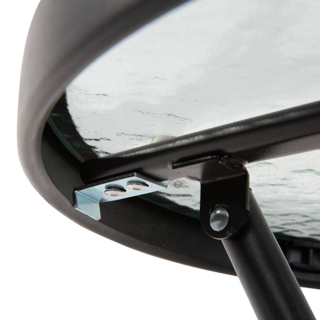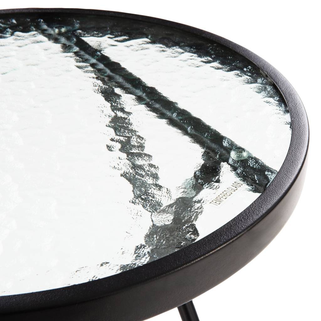 The tabletop surface is made of tempered glass, which provides increased resistance to damage and easy cleaning. It's a durable and safe solution for everyday outdoor use.