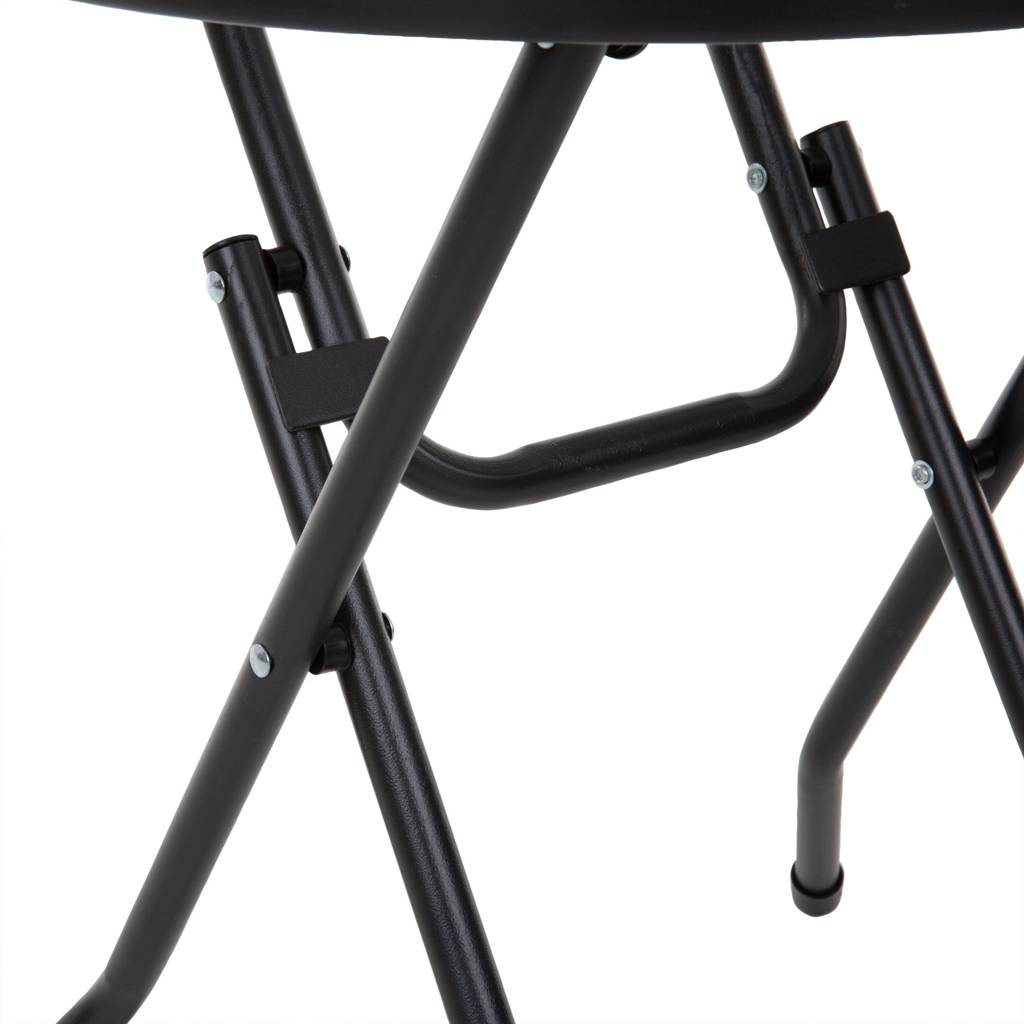 The table's frame is coated with a powder-coated finish, which enhances its durability and resistance to weather conditions. The table maintains stability even on uneven ground.
