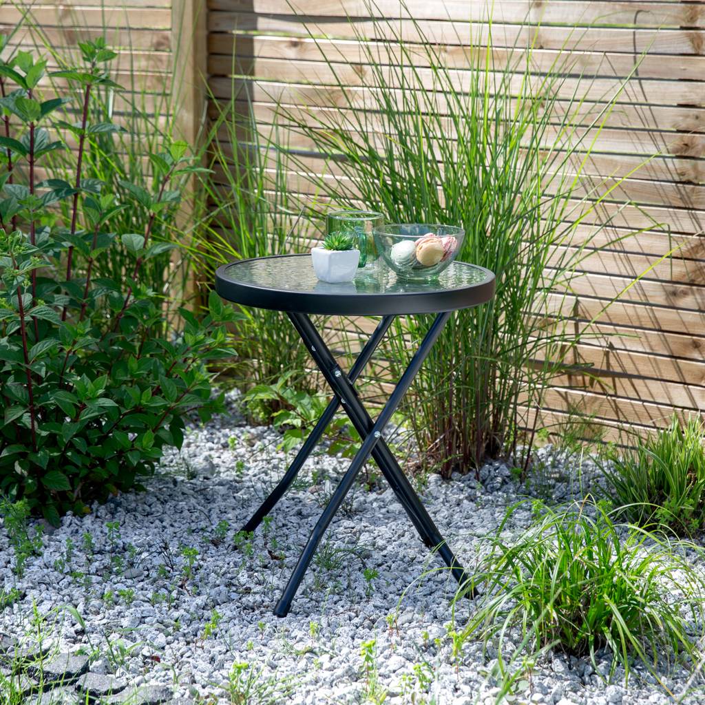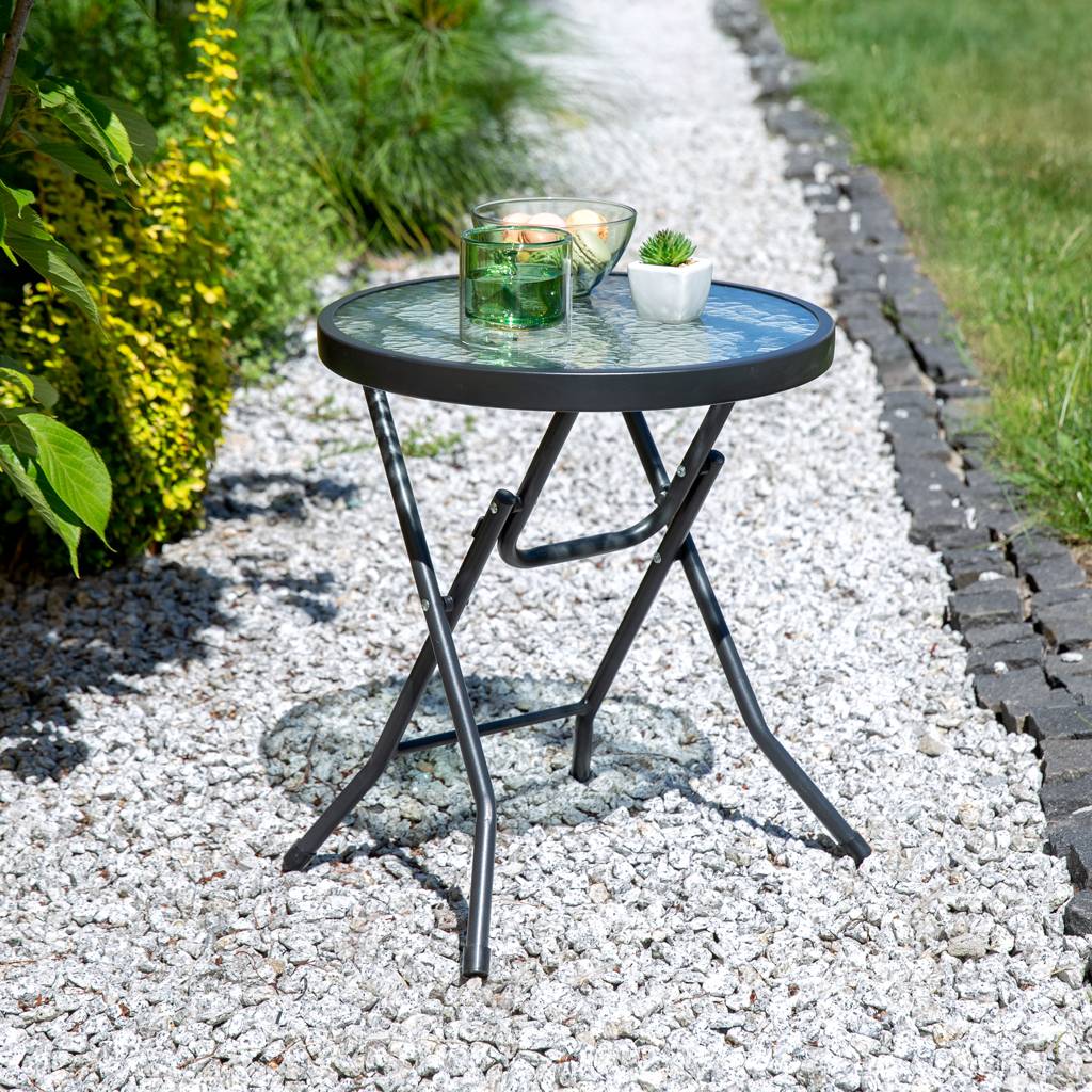 Small garden table with tempered glass top is an ideal solution for a garden, terrace, balcony, and camping. The folding design enables easy storage and transport, while the powder-coated steel frame provides stability and durability. The glass garden table is weather-resistant, easy to clean, and ready for use without the need for assembly. It's a functional piece of furniture for any outdoor space.