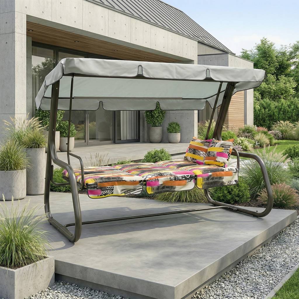 The Rimini model is a large, foldable garden swing ideal for 4 people. Equipped with a solid, powder-coated steel construction, it ensures stability and durability. The reclining seat allows for relaxation in a lying position, while soft cushions and armrests enhance user comfort. The adjustable canopy is made of WATER REPELLENT impregnated fabric. Thanks to the special hydrophobic coating, liquid stays on the surface, preventing immediate water absorption.
