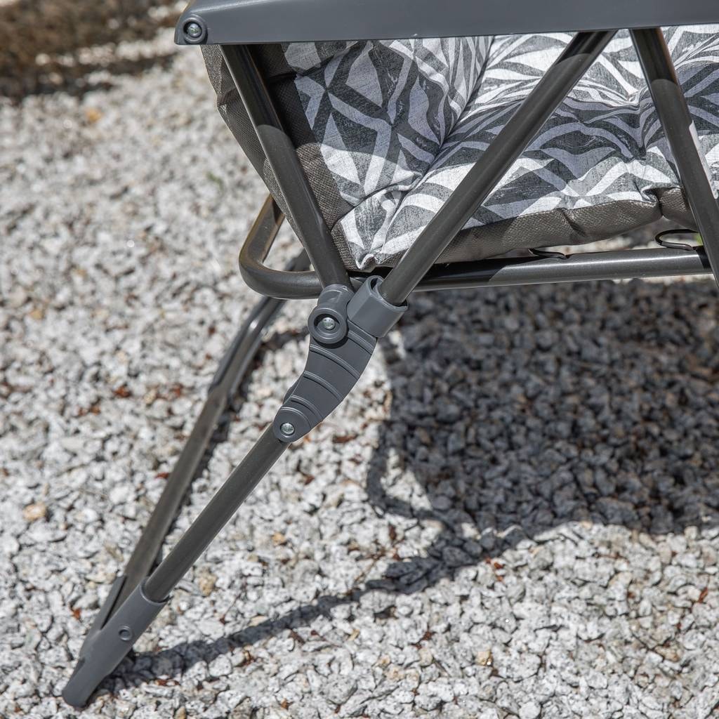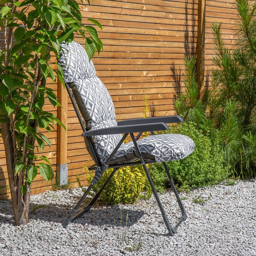 The folding garden chair with a cushion combines functionality, comfort, and elegance. Thanks to the 28-position backrest adjustment, you can perfectly tailor the seating position to your needs. The frame made of steel tubes, powder coated, ensures durability and resistance to weather conditions. The high-quality cushion filled with cut flocke foam provides comfort, while its polypropylene bottom makes cleaning easier. The chair features floor-protective cover and a connector lock for increased safety.