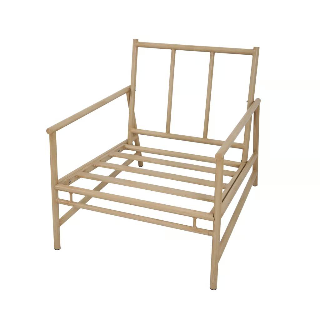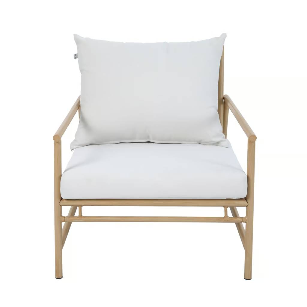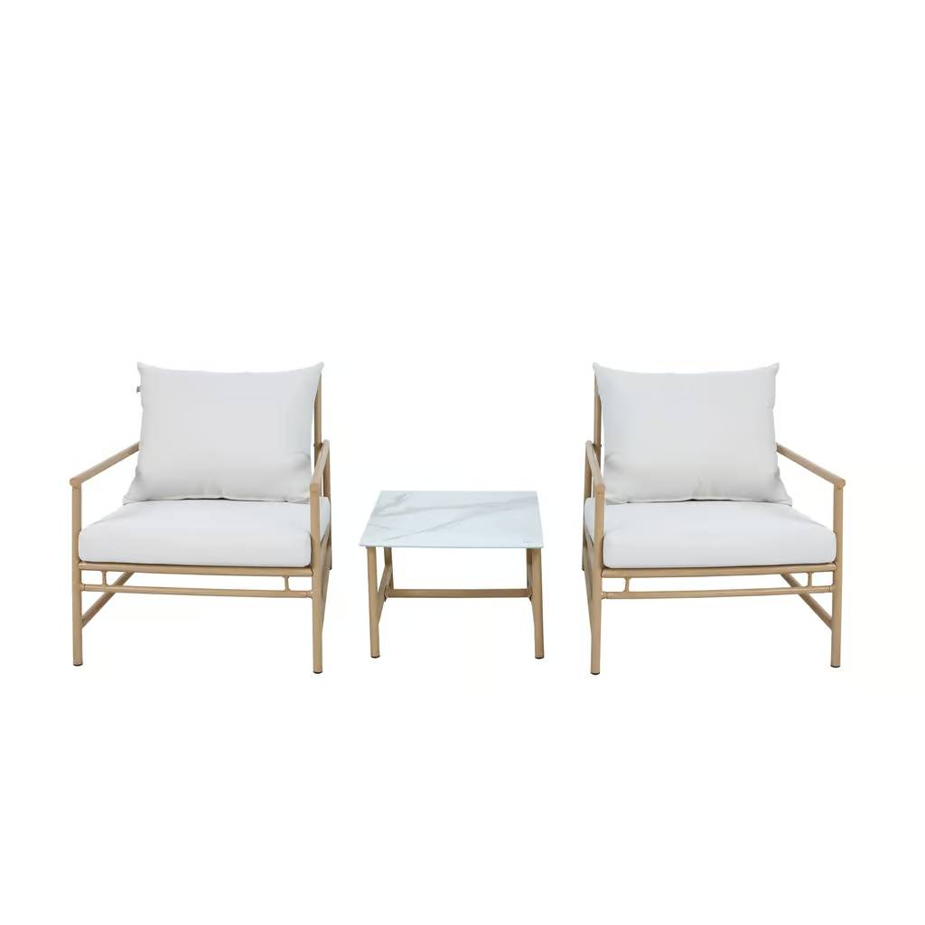 It includes two comfortable armchairs and a practical coffee table with a sturdy top made of tempered glass. The steel frames are finished to resemble natural wood, giving the set an elegant look and unique character. Included polyester cushions ensure high comfort for users. Thanks to the lightweight construction, the furniture is easy to rearrange, allowing you to quickly change the space's layout. It brings comfort and style to any relaxation area.