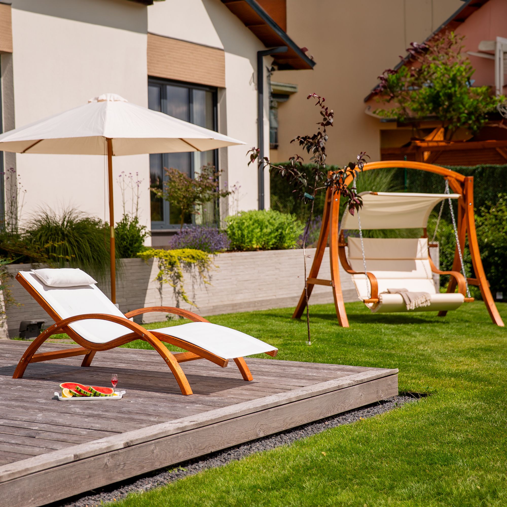 Wooden rocking lounger with comfortable textile seat, perfect for the balcony and garden.