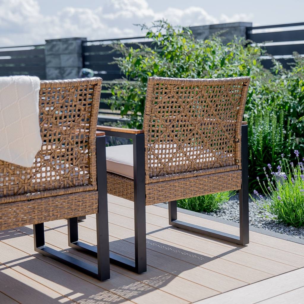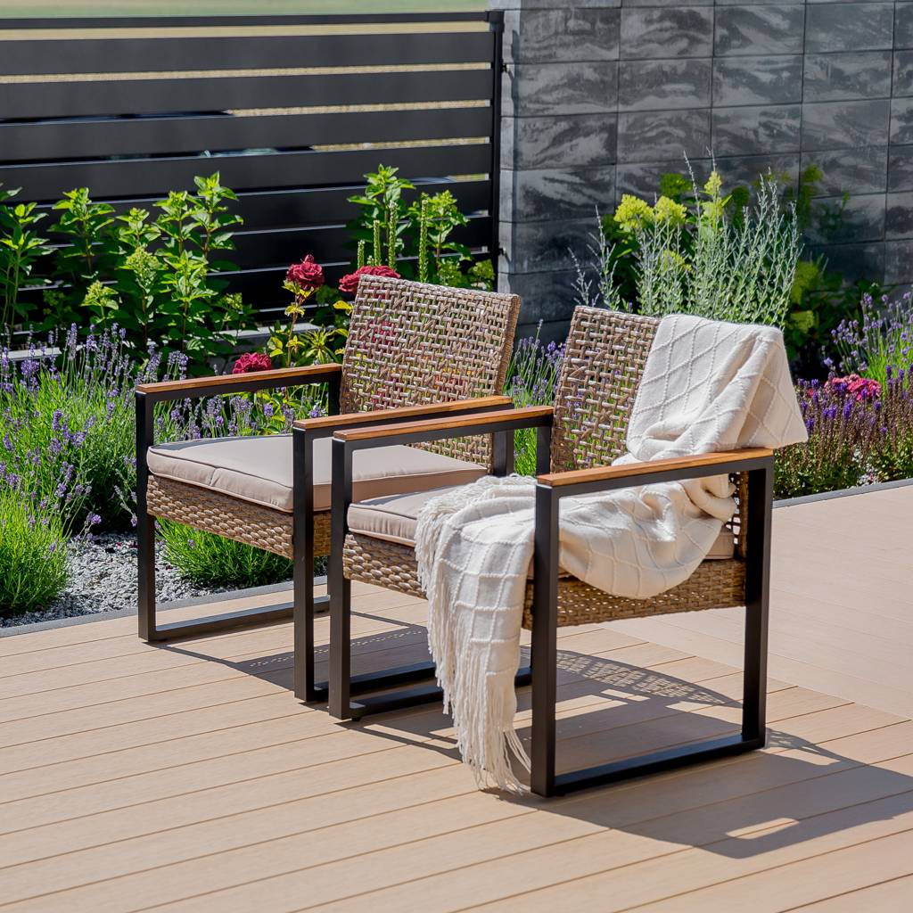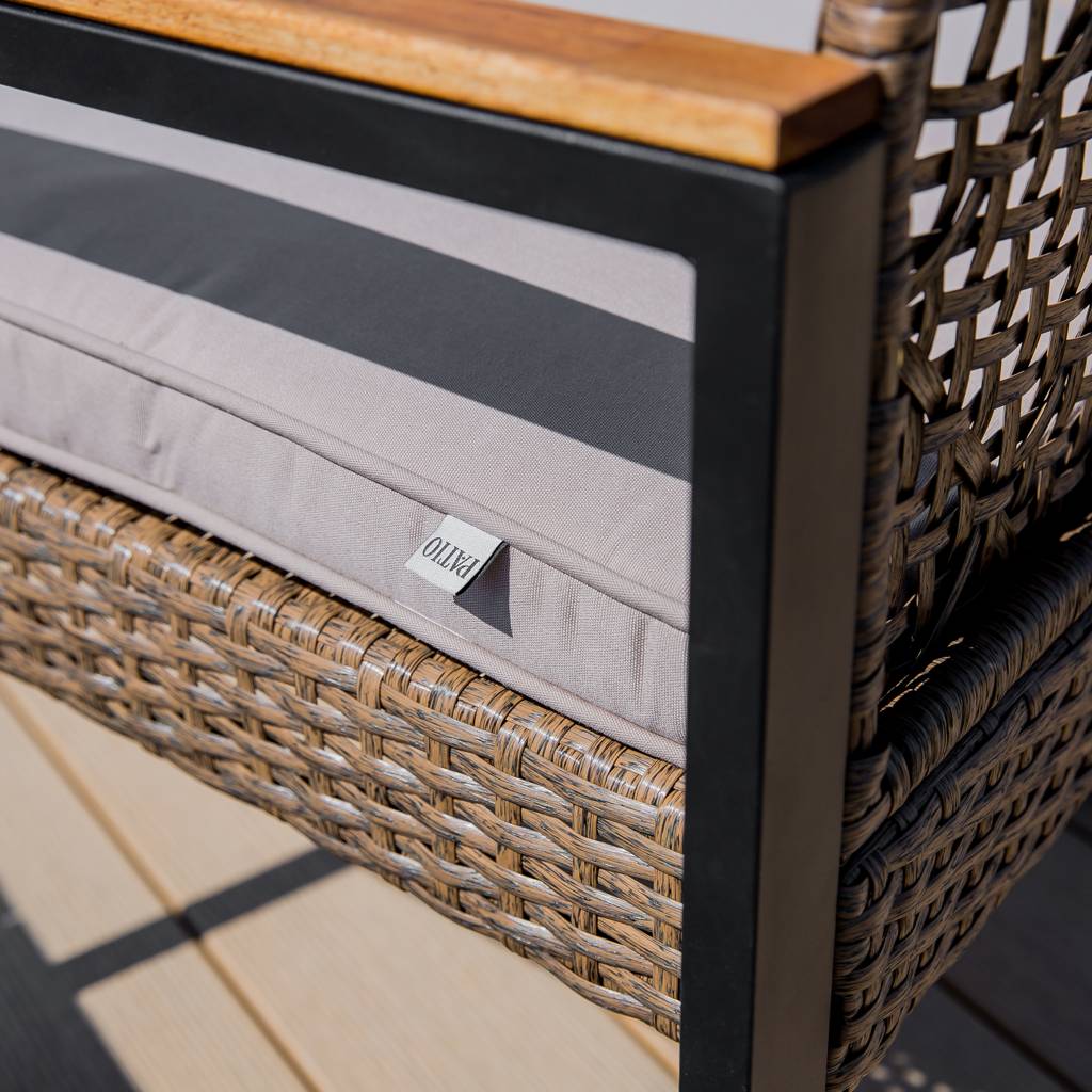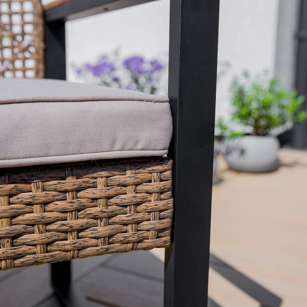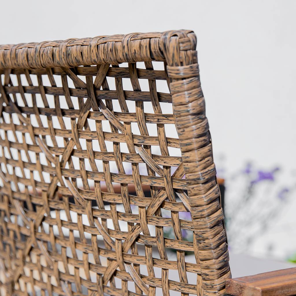 Seats and backs are made of polyrattan, which performs well outdoors. This material is resistant to rain, UV radiation, and temperature changes. It does not deform, fade, and requires no maintenance – just wipe with a damp cloth to restore its fresh look.