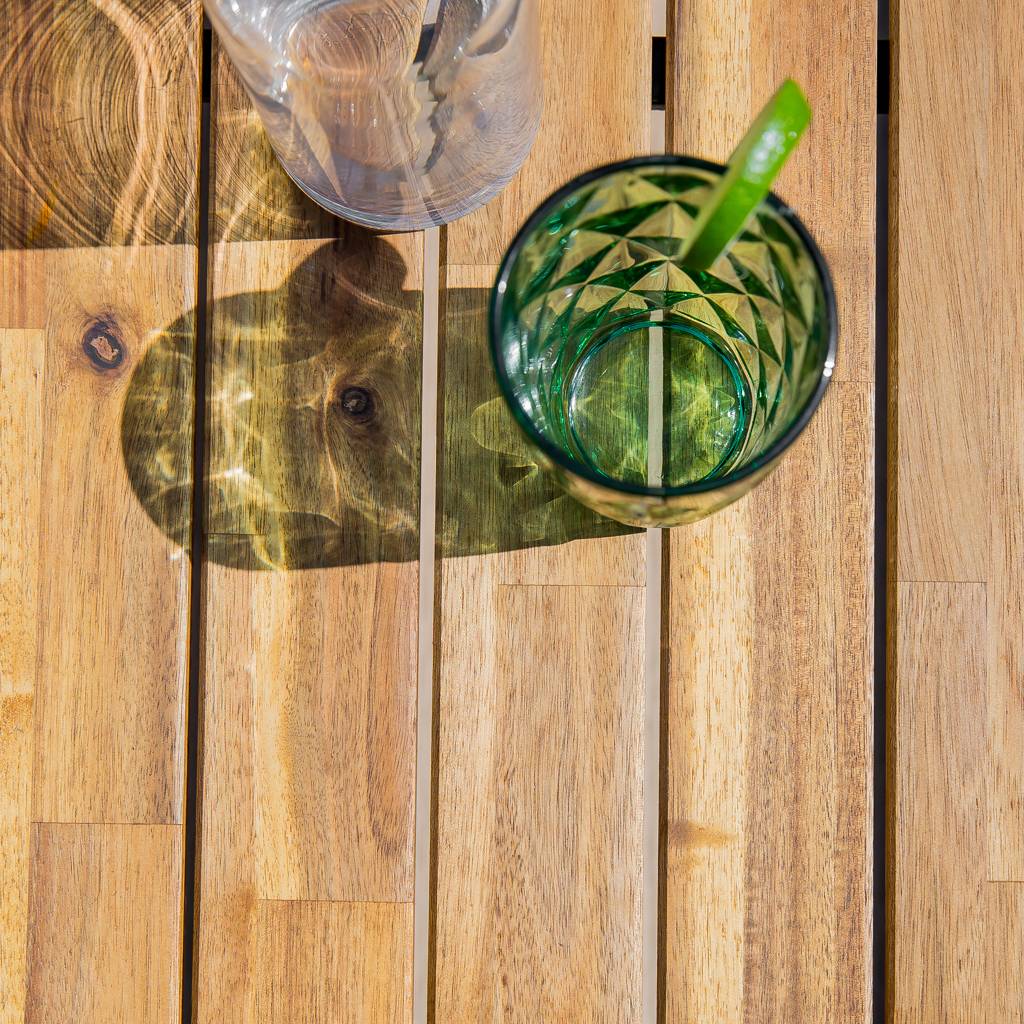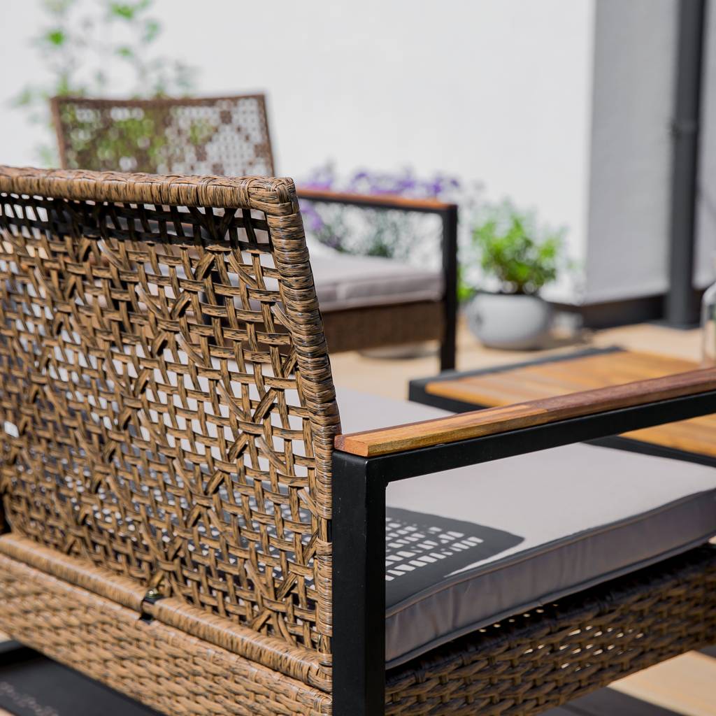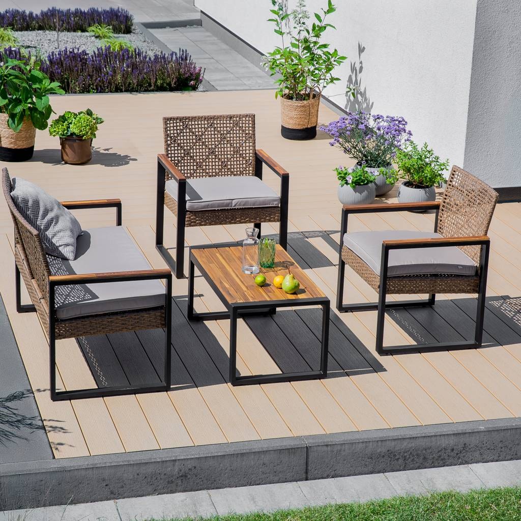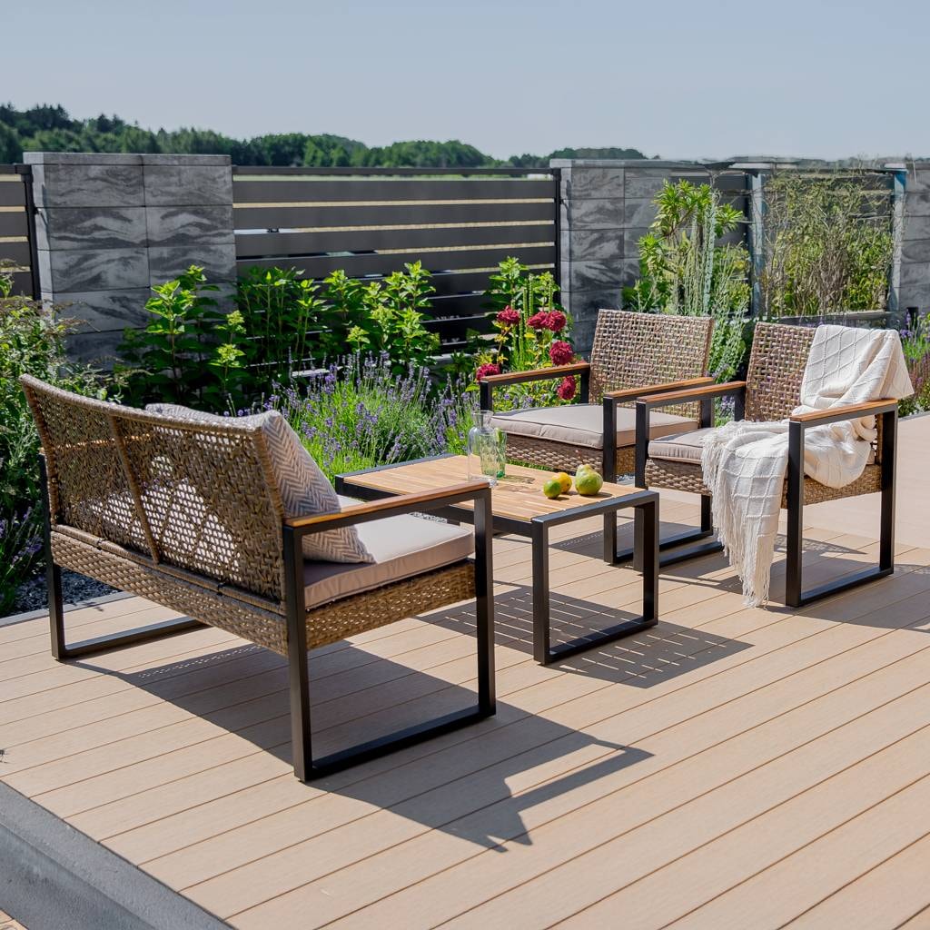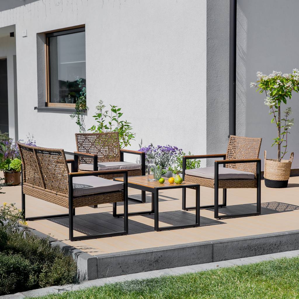 The set includes two armchairs, a two-seater sofa and a coffee table with acacia wood top – a ready solution for a garden or terrace.