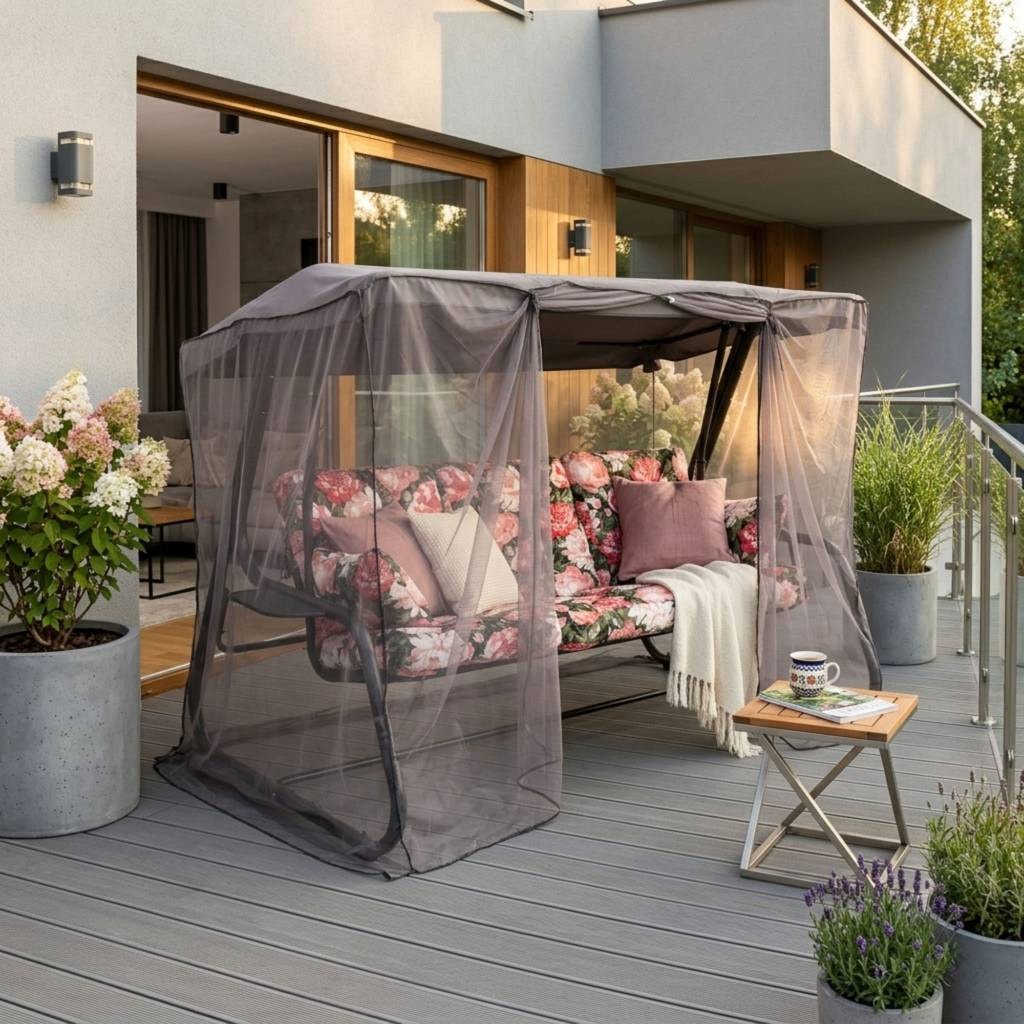 The swing is equipped with a canopy made of WATER REPELLENT fabric that shields against UV rays and light rain, while the mosquito net effectively protects against insects, ensuring peace and comfort on warm days.