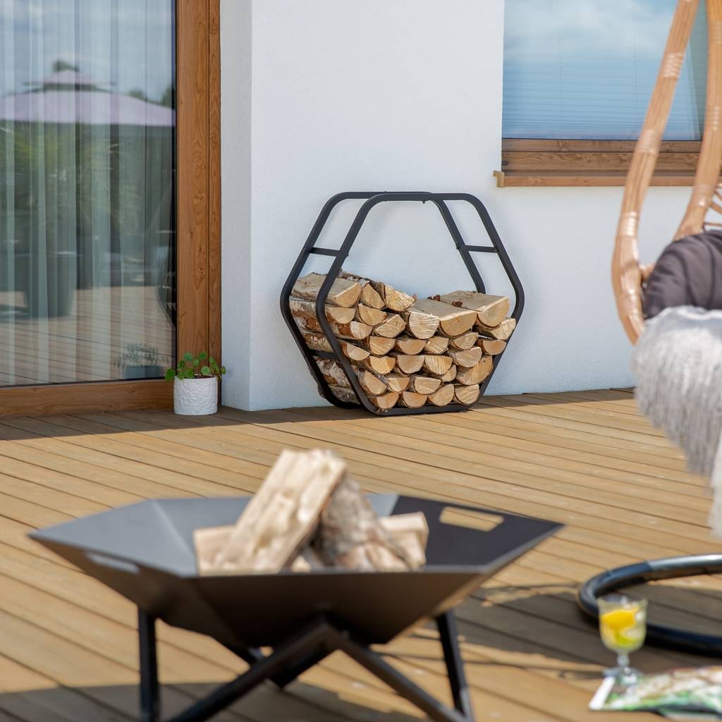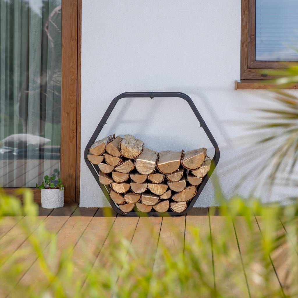 Non-standard form and practicality in one – metal firewood rack in hexagon shape is a modern and practical solution for storing firewood by the fireplace. Made of durable metal, it impresses with aesthetics and durability. Its construction provides stability and easy access to the wood, and the compact format allows it to be positioned even in small spaces. The designer look makes it not only a practical but also a decorative addition to the interior.