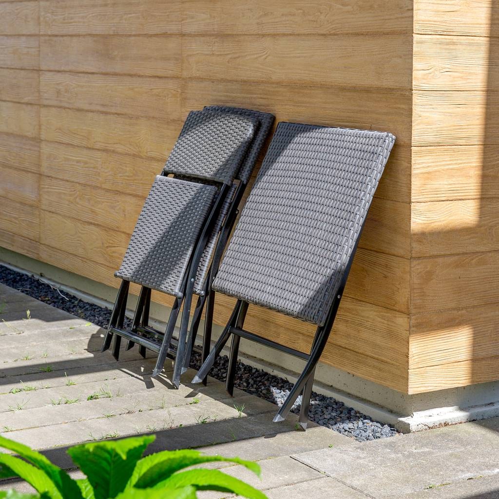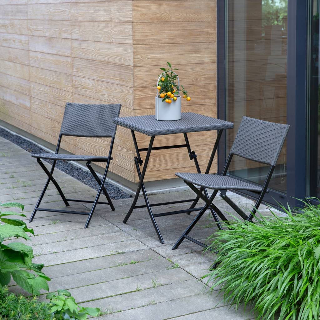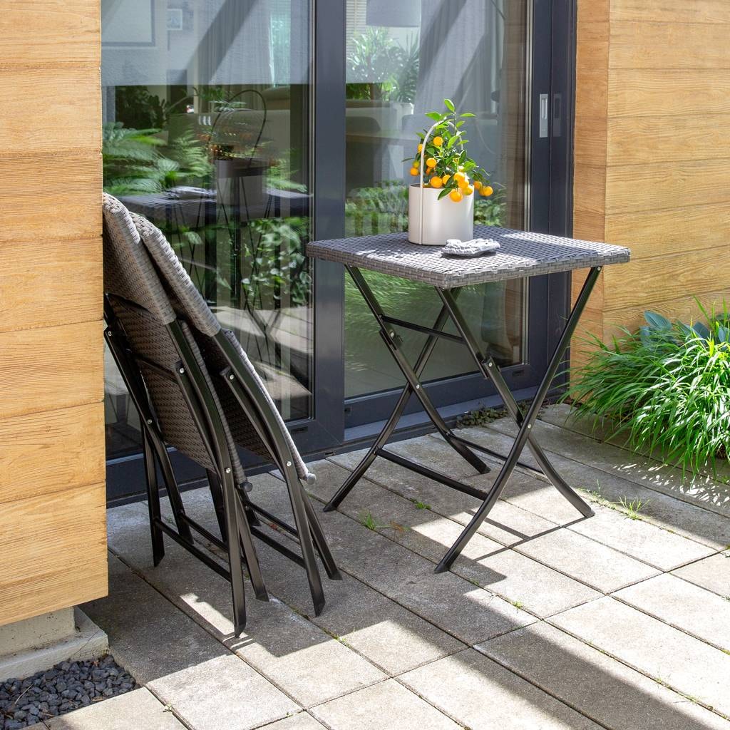 This stylish folding balcony set, made of high-quality polyrattan, is the perfect solution for any relaxation nook. The set includes two comfortable chairs and a practical table, all of which take up little space when folded. The powder-coated metal frame ensures durability and resistance to corrosion. It is perfect for both balcony and garden use, offering comfort throughout the entire season.