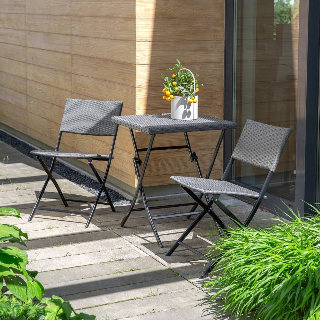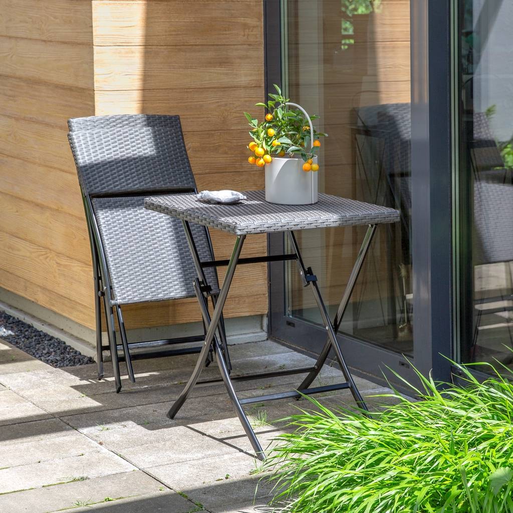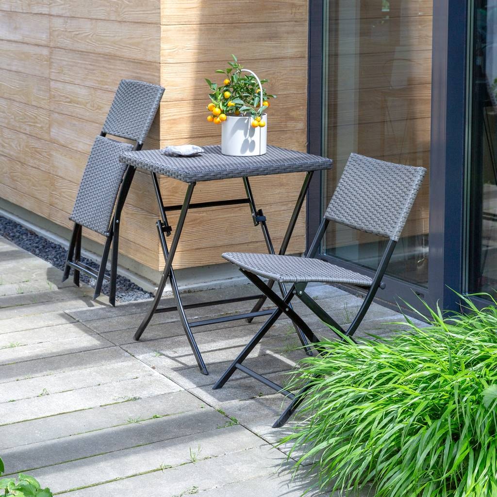 This stylish folding balcony set, made of high-quality polyrattan, is the perfect solution for any relaxation nook. The set includes two comfortable chairs and a practical table, all of which take up little space when folded. The powder-coated metal frame ensures durability and resistance to corrosion. It is perfect for both balcony and garden use, offering comfort throughout the entire season.