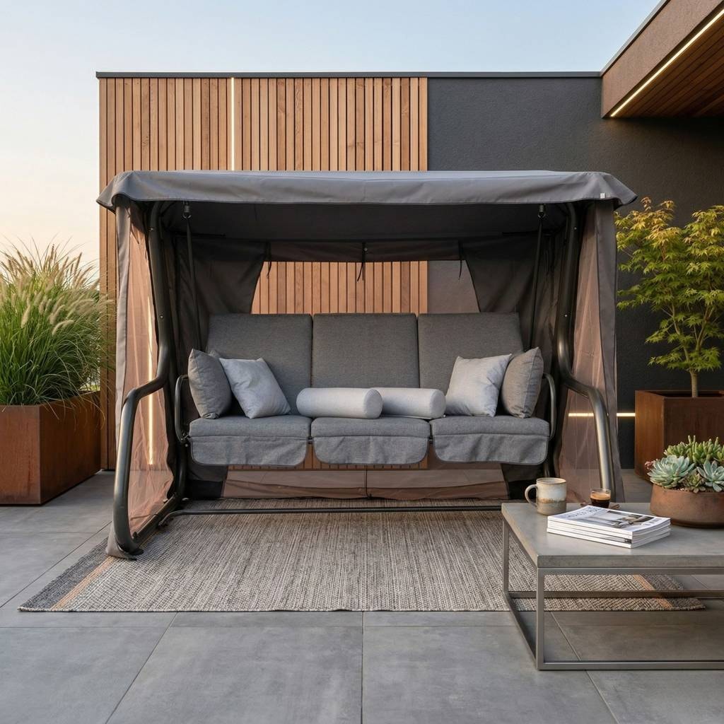 The garden swing is equipped with a set of 3 seat cushions and an additional 4 small pillows and 2 bolsters. Cushions are made of durable fabric, ensuring longevity and easy maintenance.