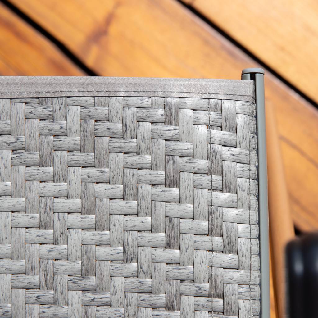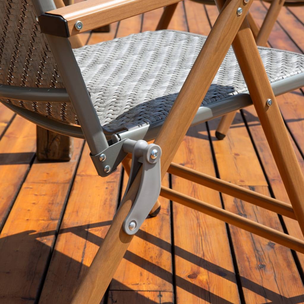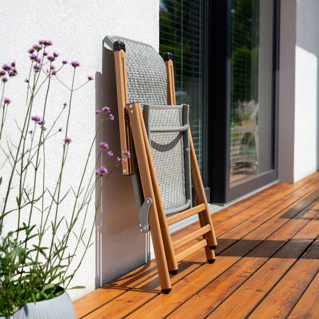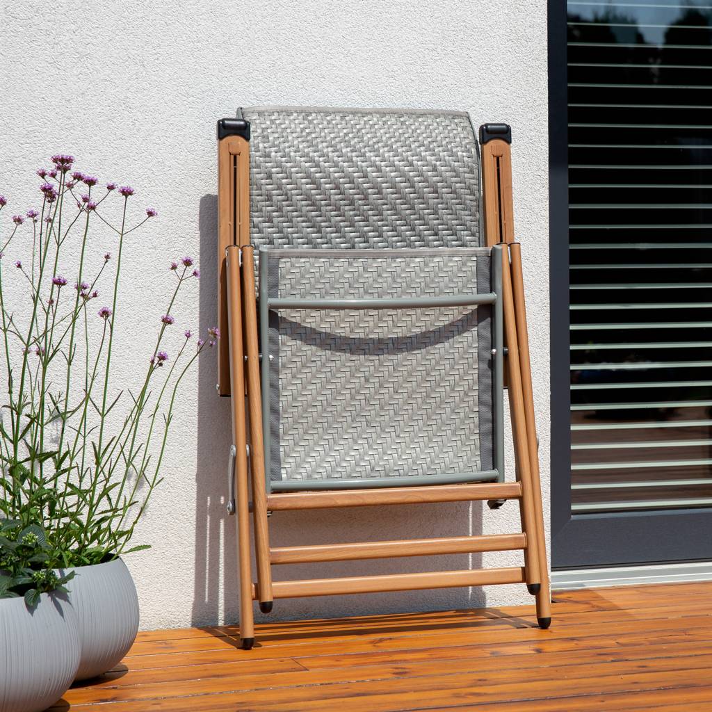 The reclinable garden chair made of technorattan offers the combination of comfort, durability and modern design. Seven-position backrest adjustment allows you to adjust the angle to your own needs. The stable steel construction guarantees durability, and the seat and backrest made of technorattan provide weather resistance. The legs of the chair are styled to look like wood – they appear natural but maintain steel strength. The garden chair can be easily stored, as it takes up little space when folded.