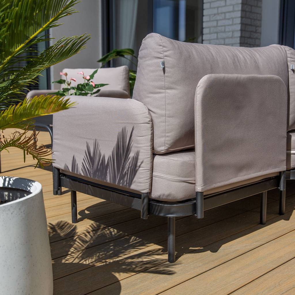Thanks to its well-thought-out design and refined details, the garden armchair with cushions Pyrite becomes an excellent choice for those who love relaxing in the fresh air. A solid frame made of powder-coated steel, comfortable cushions, and removable side and back covers ensure ease of use and maintenance. It works well as a standalone piece or as part of a larger relaxing area in a garden or living room.