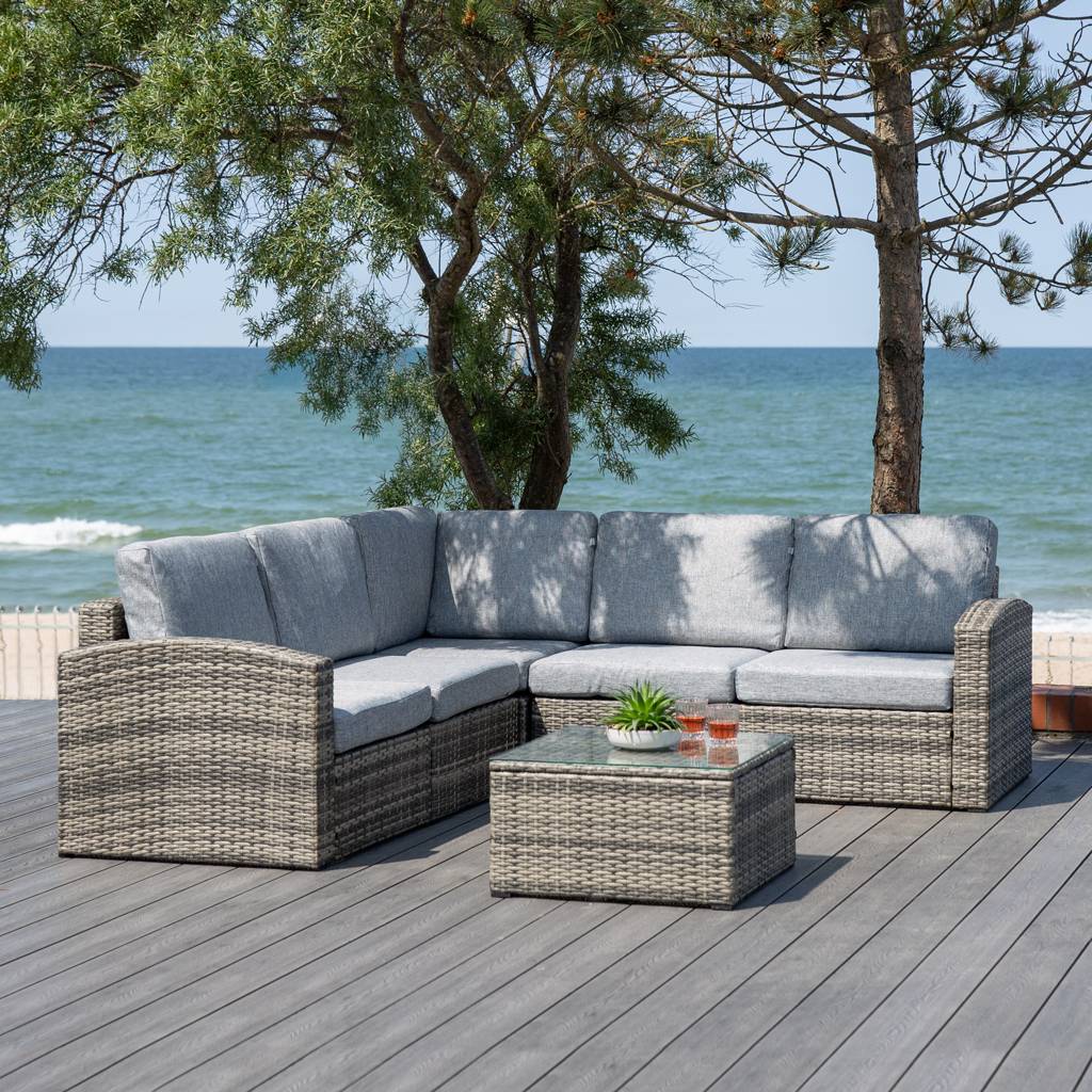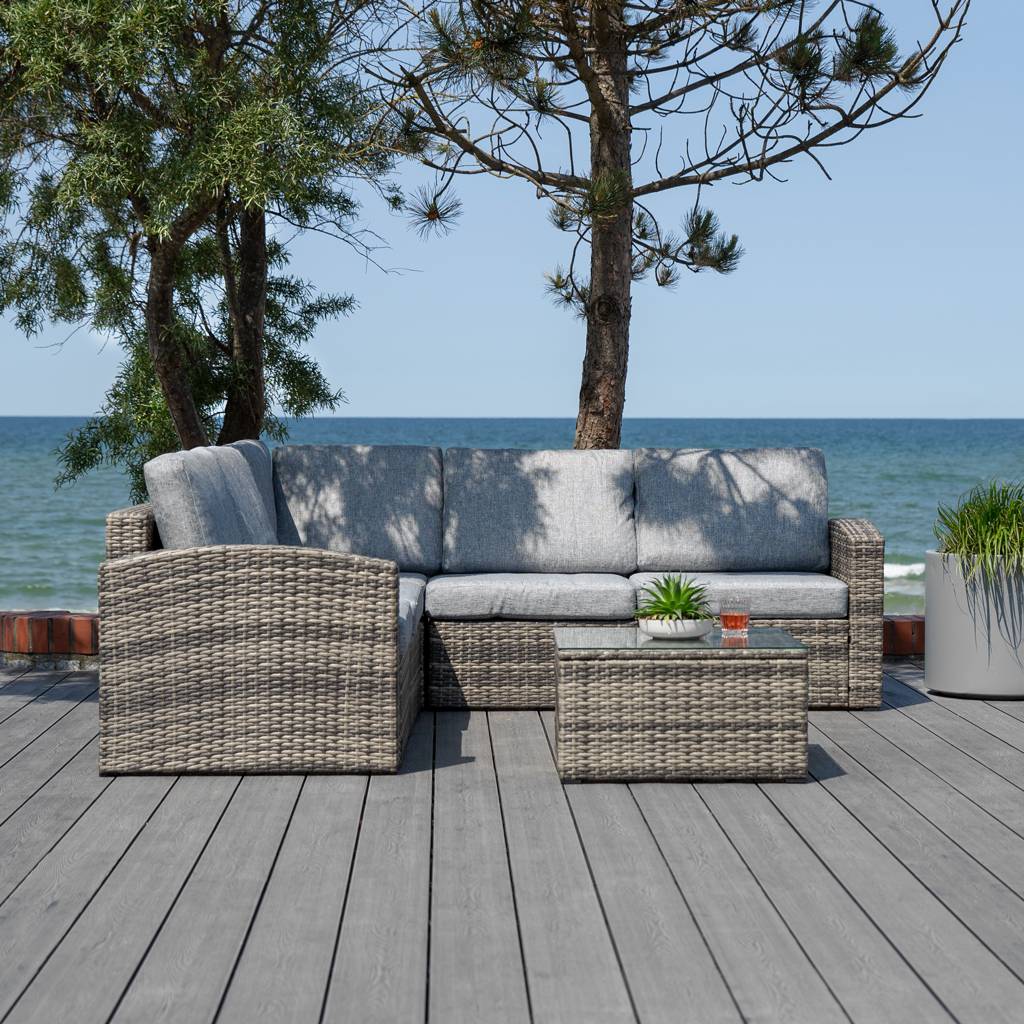 Funkcjonalny i stylowy zestaw mebli na taras wykonany z technorattanu łączy wygodę, trwałość i nowoczesny wygląd. Modułowa forma pozwala elastycznie aranżować przestrzeń, a miękkie poduszki gwarantują komfort wypoczynku. Stolik ze szklanym blatem uzupełnia całość, tworząc harmonijne miejsce do relaksu w ogrodzie, na tarasie lub balkonie.