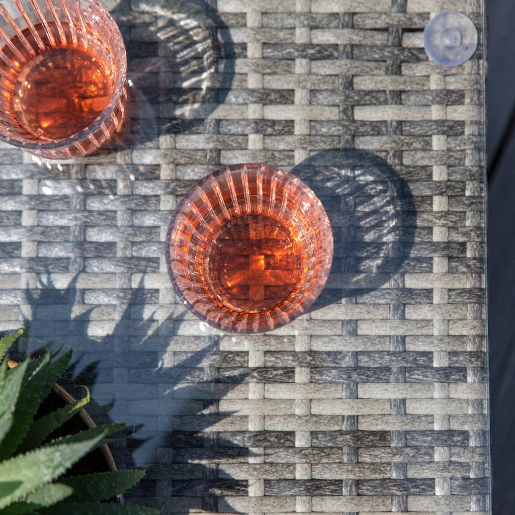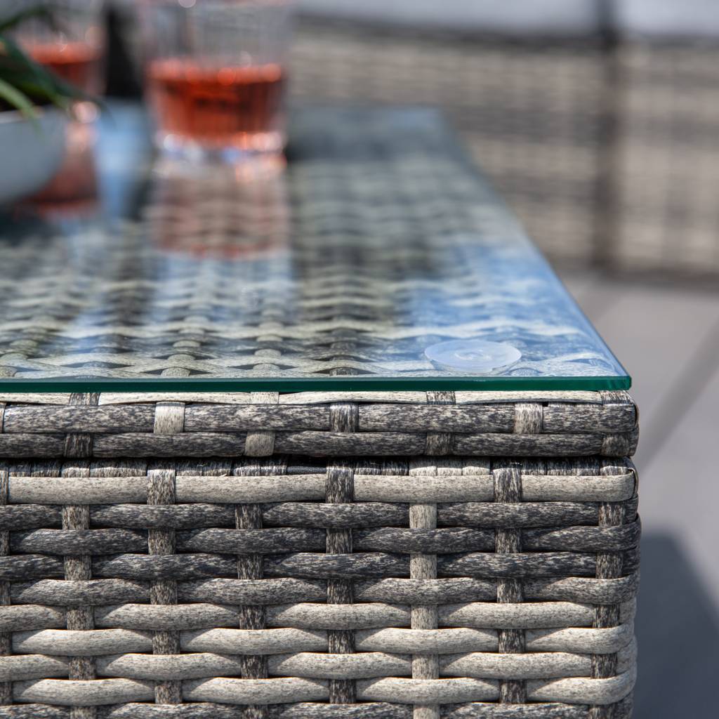Dołączony stolik wyposażony został w blat wykonany z hartowanego szkła, co zapewnia mu większą odporność na zarysowania i uszkodzenia mechaniczne. Dzięki niemu zyskujesz praktyczną i łatwą w czyszczeniu powierzchnię, która świetnie komponuje się z technorattanem i dodaje całości nowoczesnego charakteru.